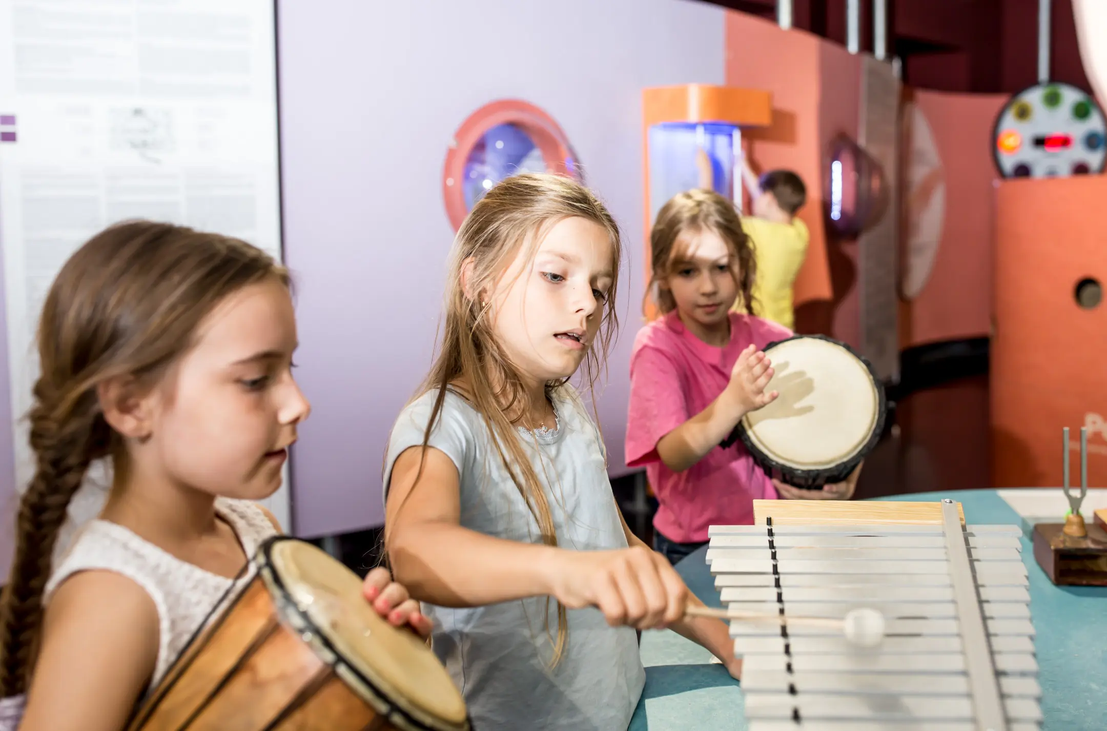 Play xylophones and metallophones and discover the basic principles of musical instruments. Take a closer look at the vibrating string of a double bass and discover why strings of different thicknesses and tensions produce different tones. Can you reliably distinguish between higher and lower notes? Which animals have the best hearing range and which ones beat yours? Do you have a good auditory memory? Do you get fooled by auditory illusions? And why do you have two ears – wouldn’t one be enough? And when you have had enough of all that self-recognition, honk out loud with a rubber plunger for cleaning the sink.
